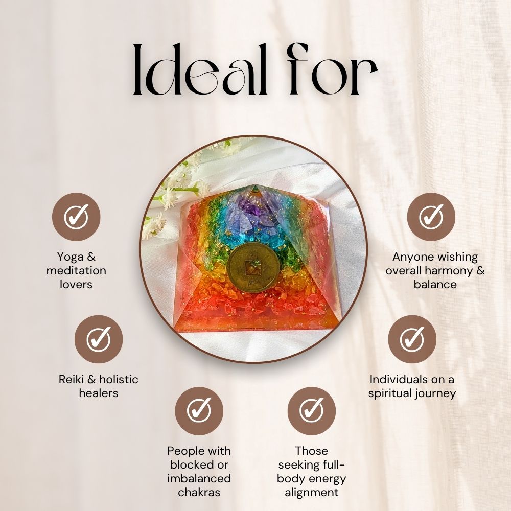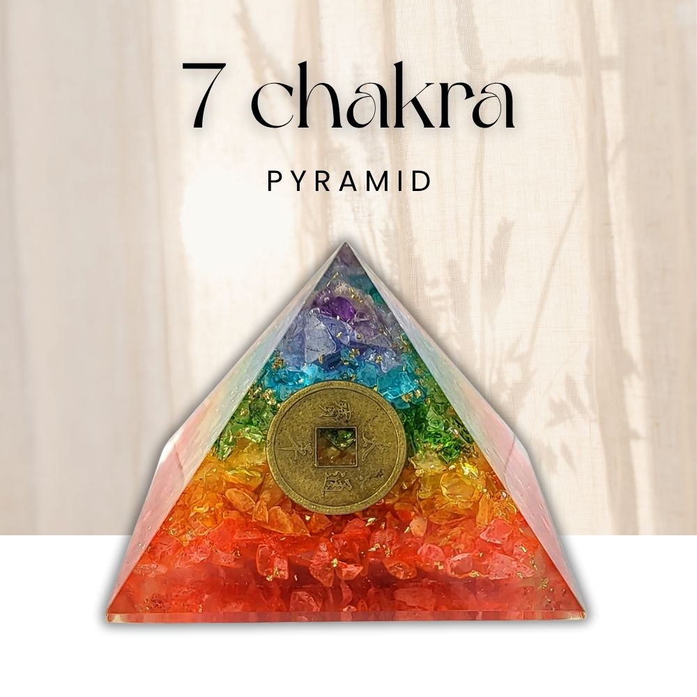 The 7 Chakra Pyramid is a powerful energy tool designed to balance and align all seven chakras in your body. Handcrafted with natural crystal chips in vibrant rainbow colors, this pyramid radiates positive vibrations and helps create harmony in your surroundings. Whether placed in your home, office, or meditation space, it works as both a healing accessory and a beautiful décor piece.