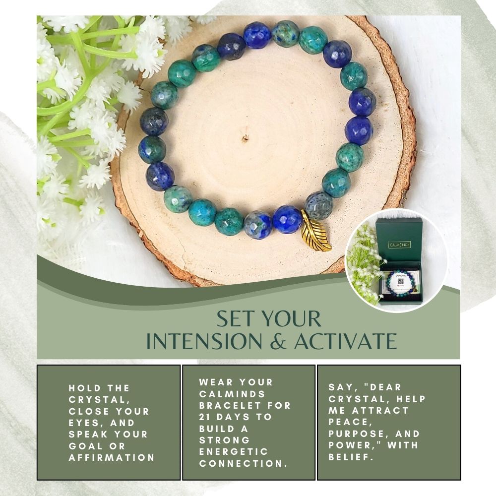 Material: Premium-quality natural Azurite crystal beads, precision diamond cut (8mm), strung on stretchable cord with a gold-plated stainless steel leaf charm.