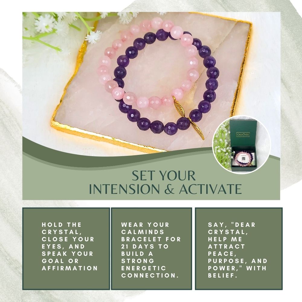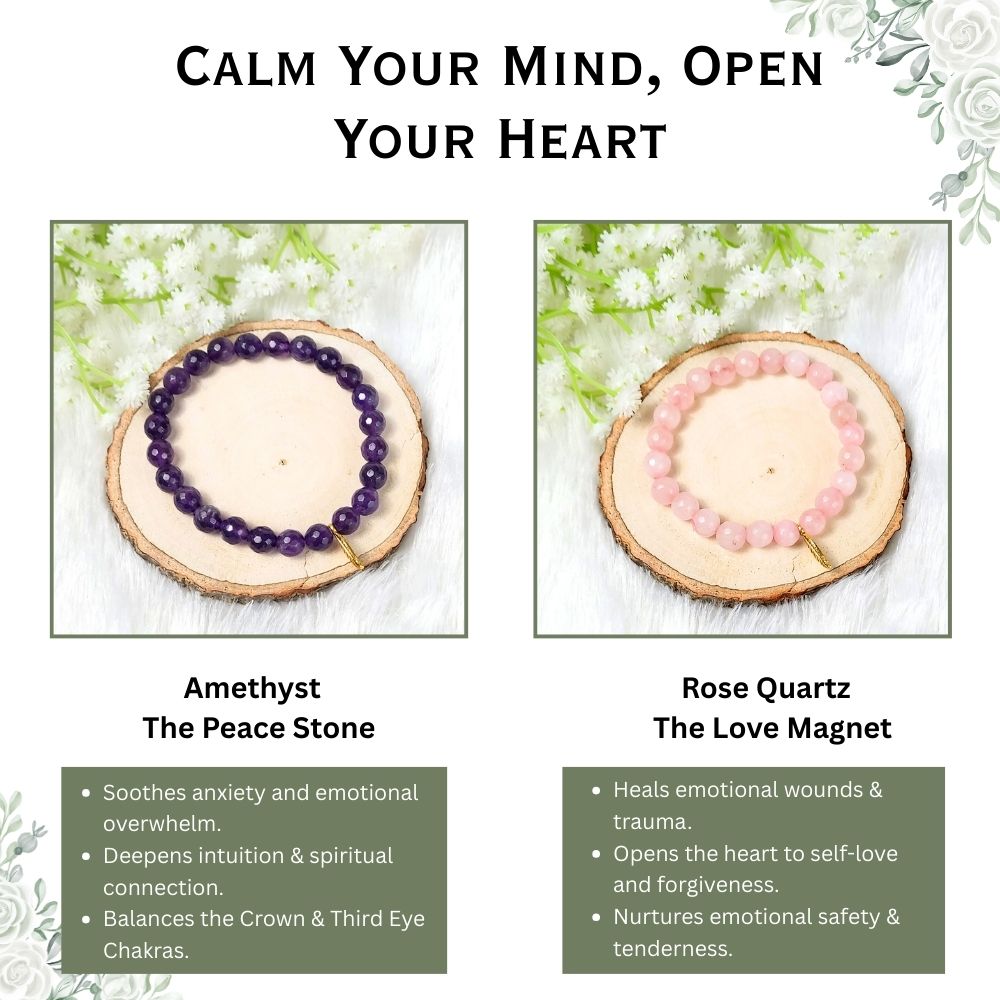 Description: Infuse your day with love, compassion, and calm with the Calminds Amethyst & Rose Quartz Bracelet Combo Set – a beautiful spiritual gift thoughtfully designed for women. Rose Quartz, the stone of love and relationships, promotes compassion, emotional healing, and self-worth. Amethyst offers mental clarity, reduces stress, and protects from negative energies. Together, they form a soothing and empowering crystal pair that enhances emotional wellness and spiritual balance. This combo set is a perfect choice for Mother's Day, anniversaries, or simply as a heartfelt gift item for women. Handcrafted from genuine crystals and packed in a premium gift box, it blends style with purpose. Whether used for daily wear, meditation, or healing, this set is a meaningful expression of care, connection, and clarity.