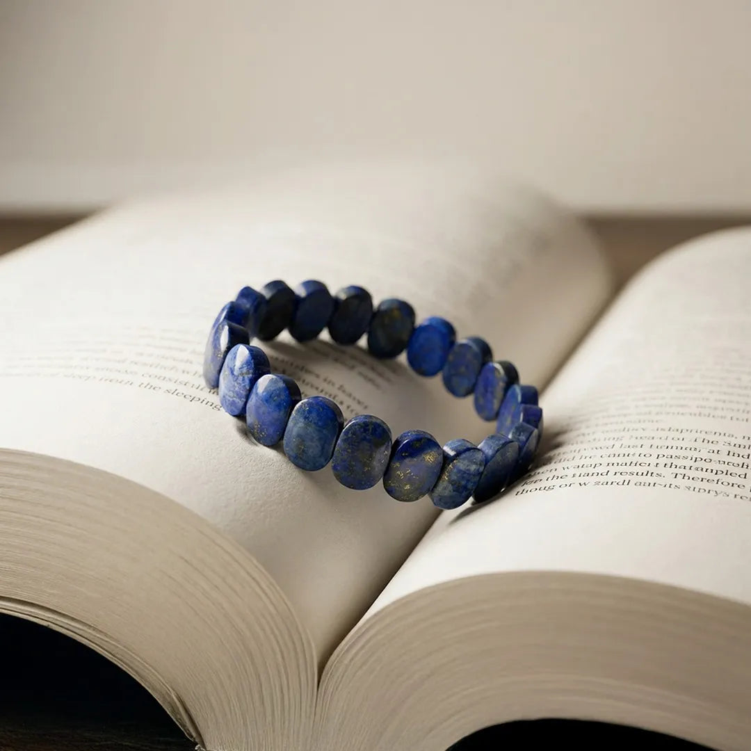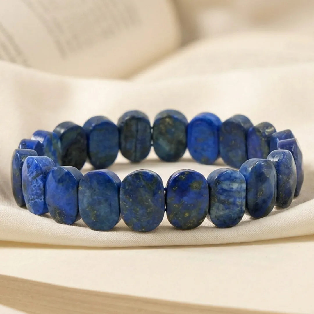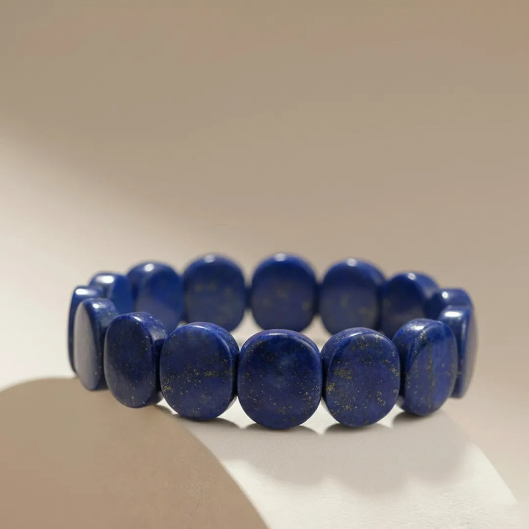 This bracelet features naturally polished oval flat Lapis Lazuli beads with rich royal-blue tones and natural golden flecks (pyrite inclusions), giving each piece a unique, authentic character. The flat-bead design offers a bold yet refined look, making it suitable for both everyday wear and special occasions.