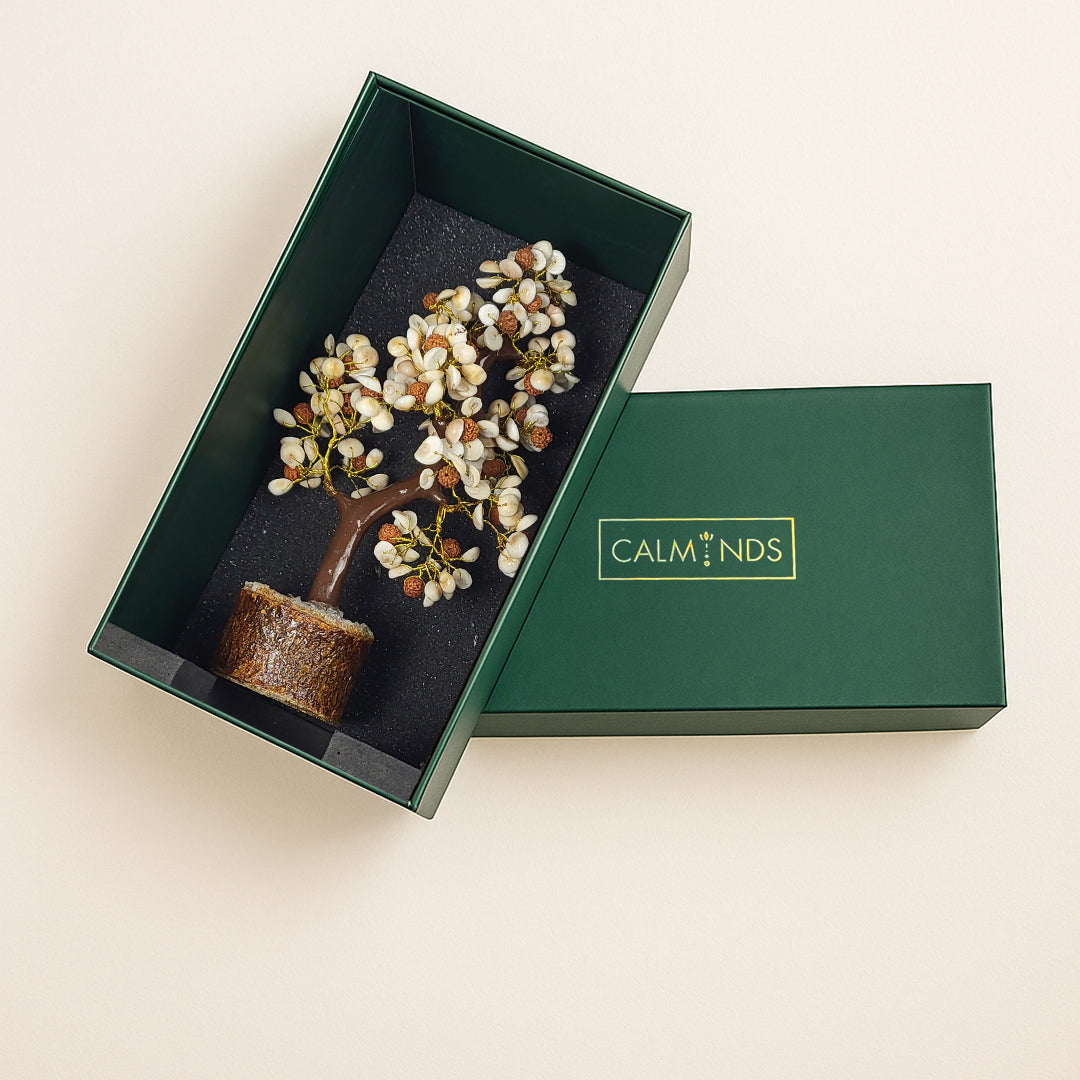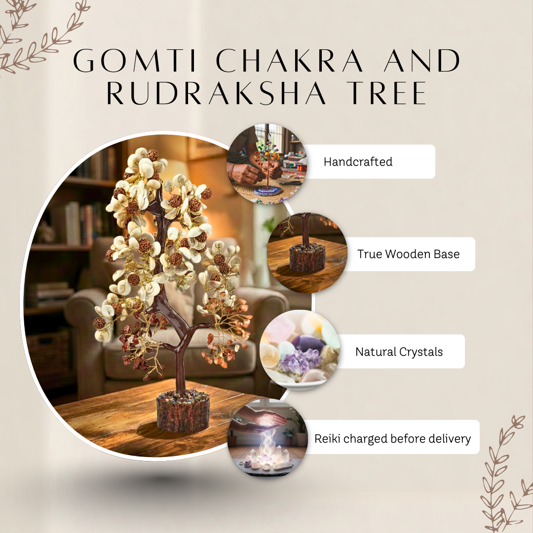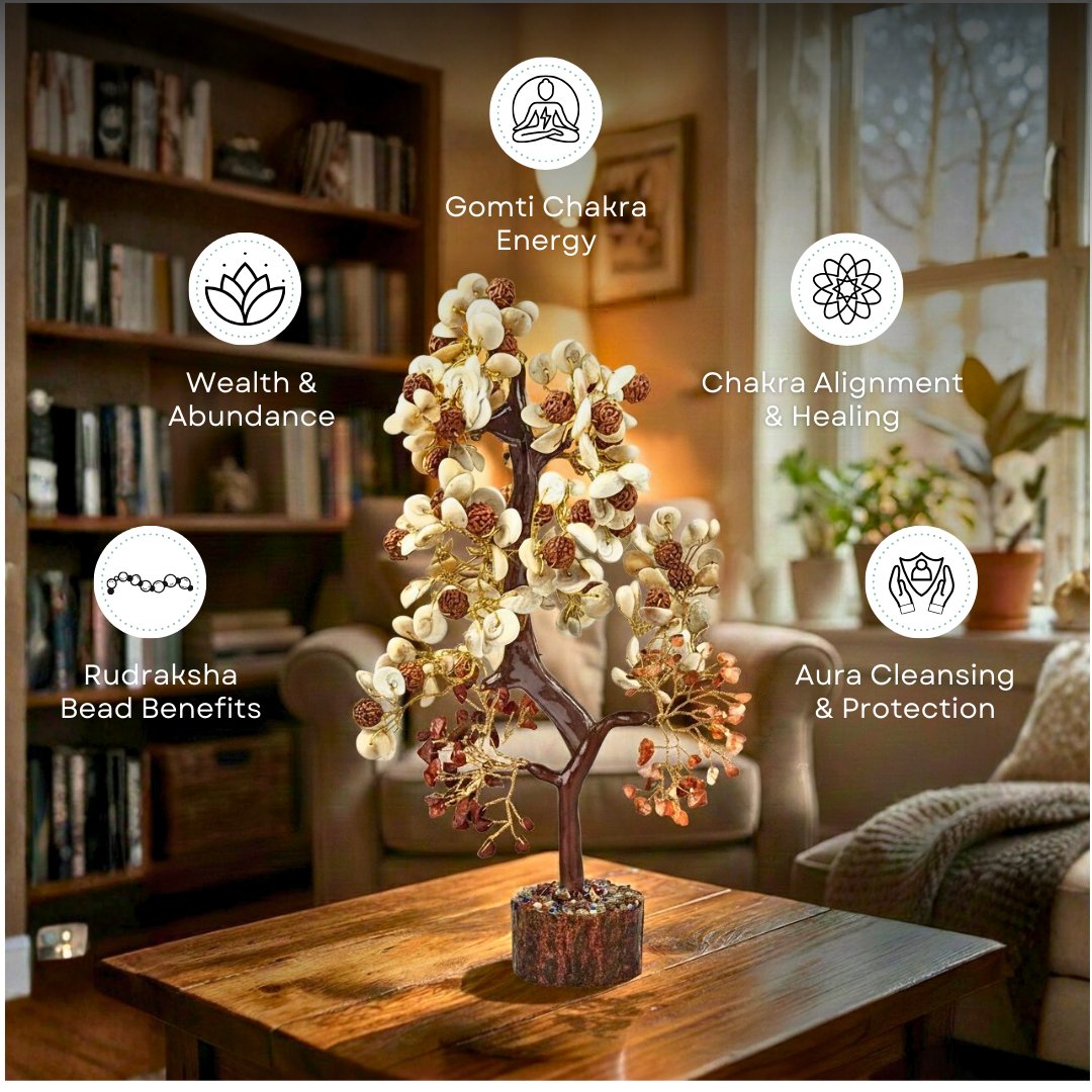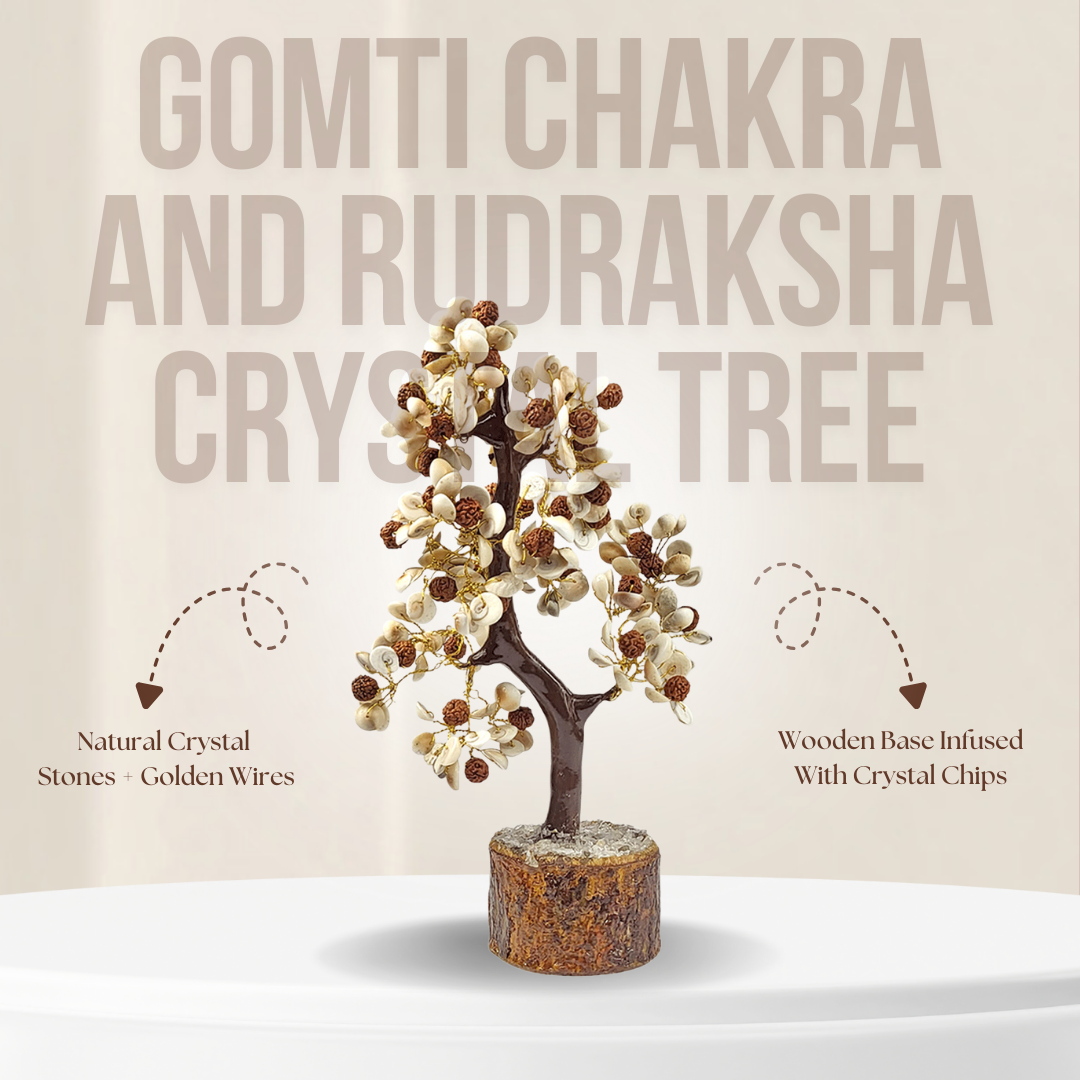 Bring harmony and prosperity into your space with this handcrafted Gomti Chakra and Rudraksha Crystal Tree. Designed with natural Gomti Chakra stones and Rudraksha beads on golden wire branches, this elegant home decor tree rests on a polished wooden base. Perfect as table decor or a meaningful home decor gift, it adds a touch of spirituality and serenity to any setting.